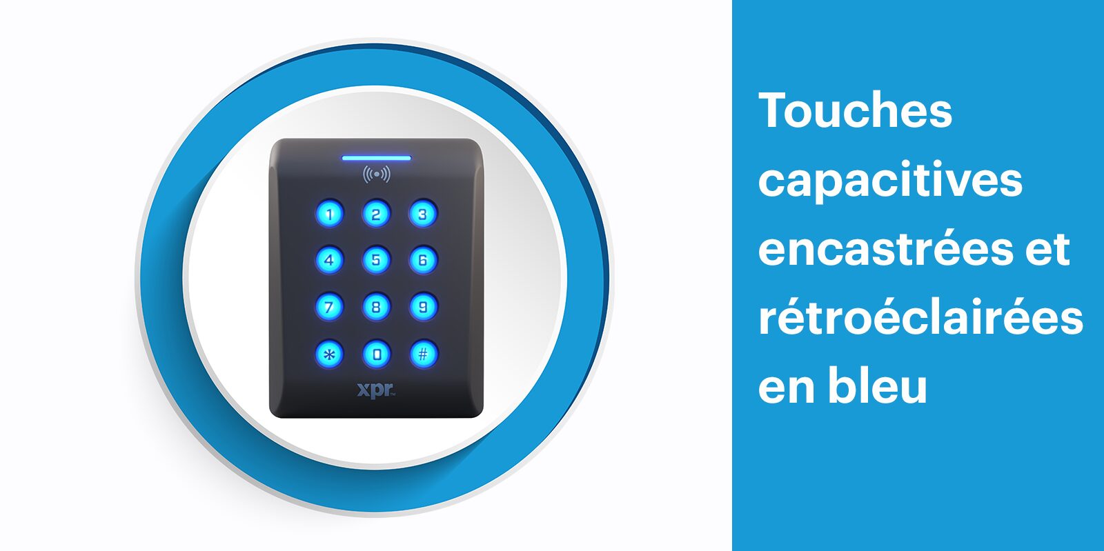Le XP-K est doté d’un clavier rétroéclairé bleu. Lorsqu’un code ou une carte est présenté, la LED supérieure du clavier devient verte lorsque l’accès est autorisé ou rouge lorsqu’il est refusé. Chaque pression de touche est accompagnée d’un léger bip sonore.